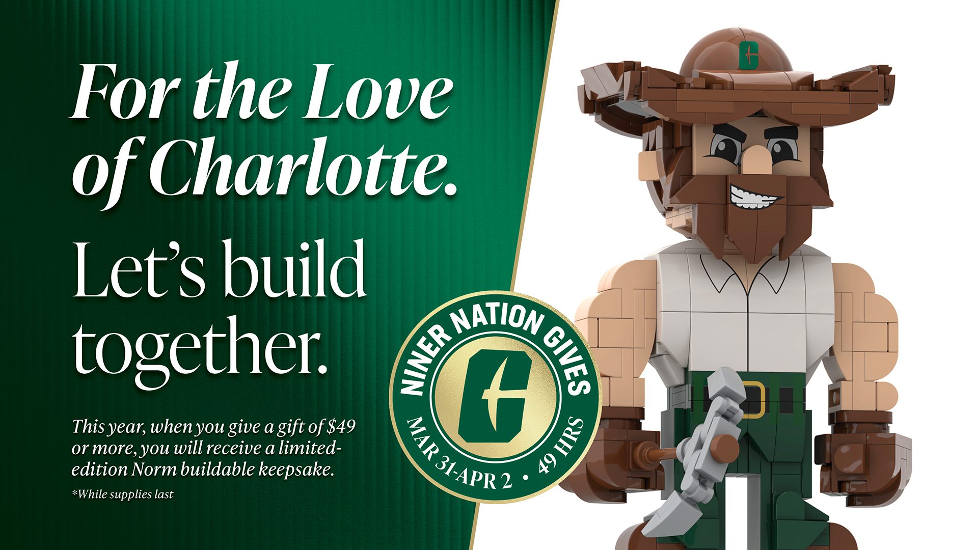 Charlotte has never built anything alone. It takes all of us—faculty, staff, students and alumni—laying foundations, raising walls and opening doors. When you give, you’re not just donating. You’re building together with the entire Niner community, past, present and future.